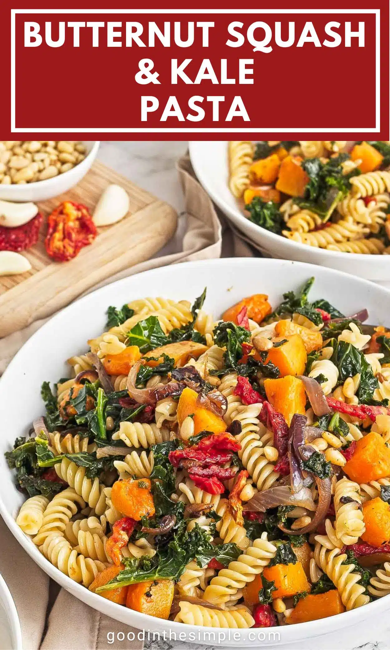This vibrant pasta dish is for you if you're craving the comfort food of pasta but wanting something a little more nutritious and healthy. Butternut Squash Kale Pasta is loaded with veggies and perfect al dente fusili (or whatever pasta you like, we don't discriminate). It has pine nuts for crunch and a light lemony flavor. Every bite is a delight.